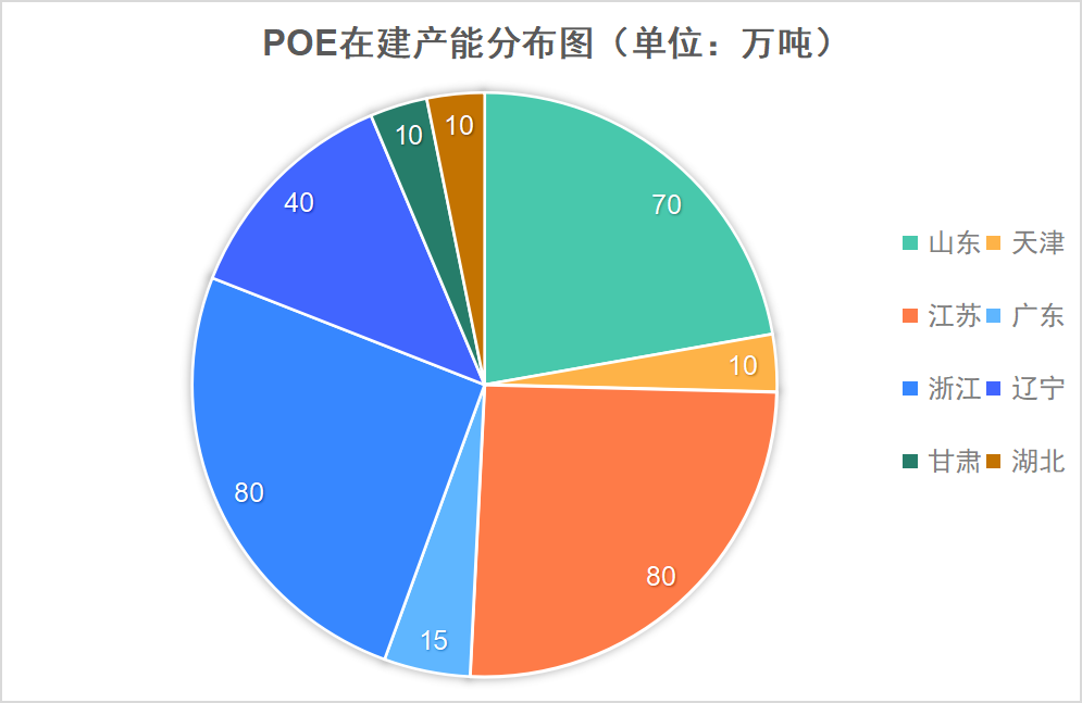 依照統(tǒng)計來看,POE的在建項目主要分布在東部沿海,江蘇、浙江、山東以及遼寧地區(qū),規(guī)劃產(chǎn)能已經(jīng)突破300萬噸。